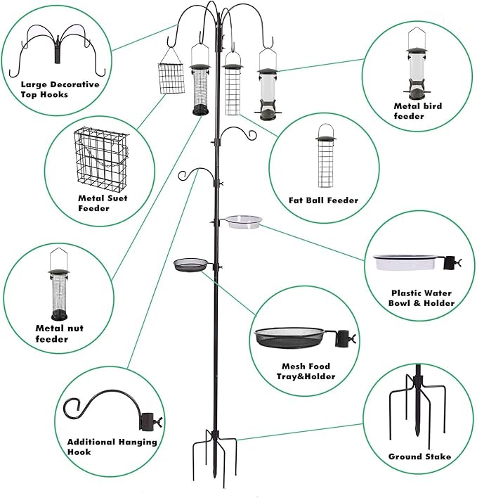 - Bird Feeding Station Kit With Hooks & Trays: Bird feeder pole comes with 4 large top level hooks which are ideal for hanging longer and larger feeders and is followed by two additional hooks which are completely adjustable anywhere on bird feeder pole and effective for hanging smaller feeders and attracting birds. Wire mesh tray is great for mealworms, nuggets, suet, fruit, even seed mixes and plastic water bowl included in the box is ideal for birdbath
