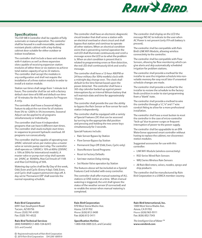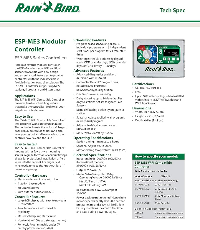 - Upgrade the ESP-ME3 to a SMART controller by adding the LNK WiFi module and a WR2 rain sensor. The LNK makes programming and monitoring easy through the enhanced Rain Bird app.