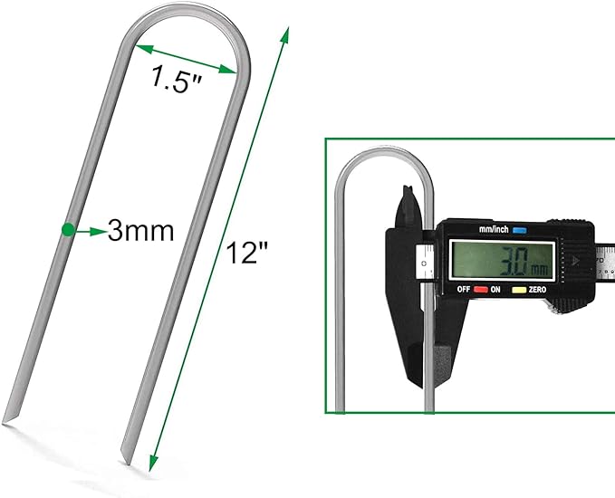 - 12 INCH 11 GAUGE STAKES - 12" length, 1.5" width, 11Ga (3.0mm) diameter, 50 pack extra heavy duty galvanized 12 inch metal garden stakes sinks deep into the ground, great for outdoor use, can secure tents, dig dog fence, chicken wire mesh, invisible fencing,Christmas decorations.