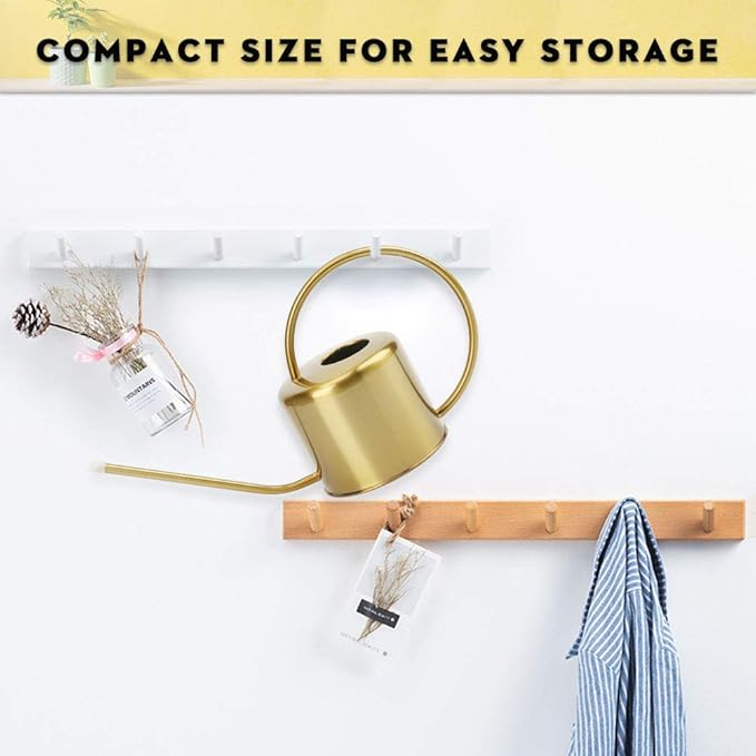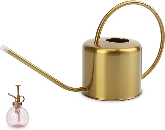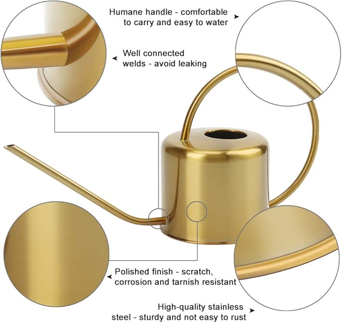 - 【FUNCTIONALITY AND DECORATION IN ONE STAINLESS STEEL WATERING CAN】Do you often forget watering your plants? Then this vintage watering can will remind you! There is a narrow, hollow pipe near the base of the watering pot indoor that enables the water to travel up through the handle and ends up exiting through the spout. Fit for all kinds of indoor or outdoor plants, especially for succulent plants. Nice looking metal with elegant gold paint makes watering pail a decent decoration