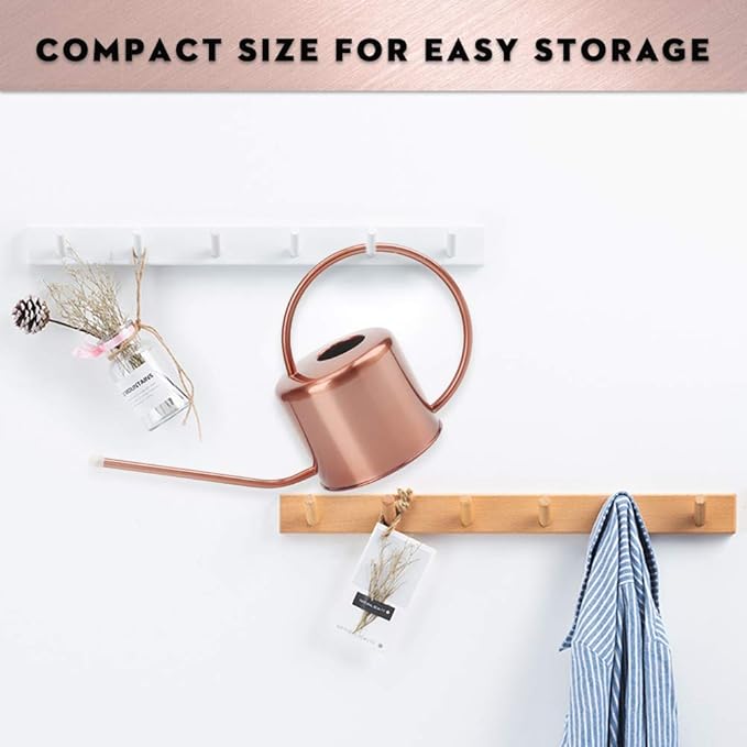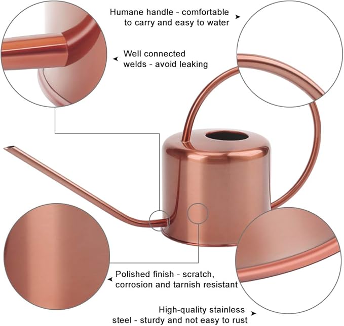 - 【FUNCTIONALITY AND DECORATION IN ONE STAINLESS STEEL WATERING CAN】Do you often forget watering your plants? Then this vintage watering can will remind you! There is a narrow, hollow pipe near the base of the watering pot indoor that enables the water to travel up through the handle and ends up exiting through the spout. Fit for all kinds of indoor or outdoor plants, especially for succulent plants. Nice looking metal with elegant copper paint makes watering pail a decent decoration