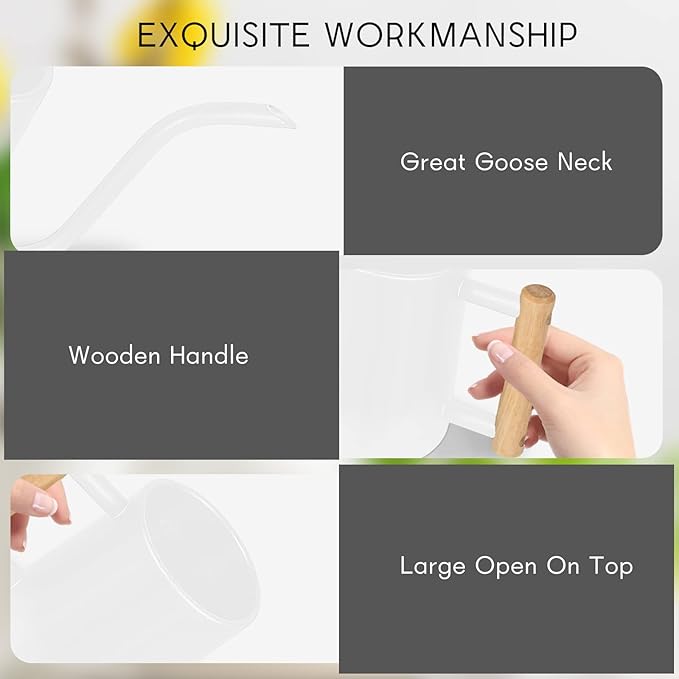 - [COMFORTABLE WOODEN HANDLE] The indoor watering can has a round comfortable wooden handle that is easy to grasp and won't cut your hands.This stainless steel watering can open built-in open top design, it is convenient to refill water