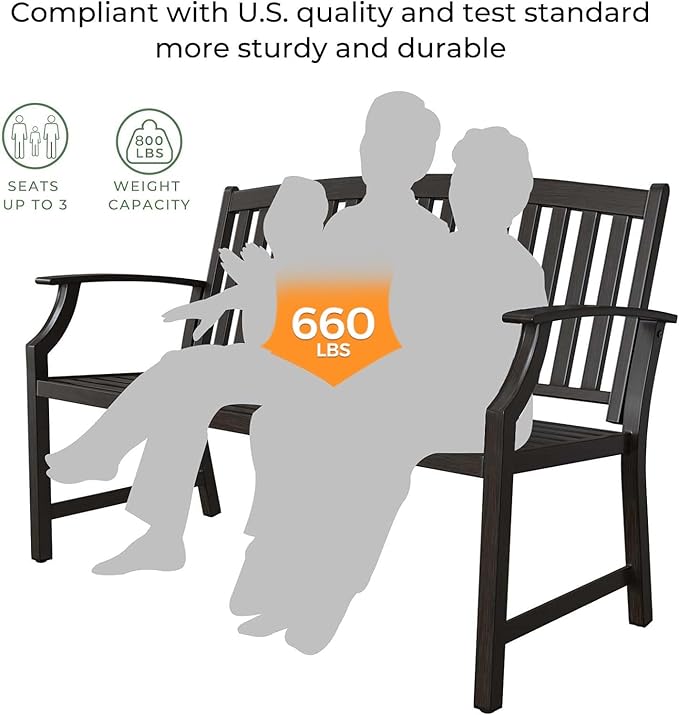 - Strong Structure: This sturdy, full-size patio bench is made of thickened steel pipes and rust free back and seat, wider and stronger armrests and backrest design makes you feel more comfortable. Max load capacity reach 660 lbs