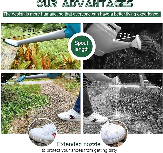 - Easy Watering: Plant watering can has a removable 16.1-inch long spout, easy to carry and store, when installing, pass the connector through the spout and screw tight, seals well with no leak. Long spout watering can easy to reach distant plants, watering easily without splashing or wasting water, it easy to control the overall water flow, directing water exactly where it is needed, allowing every part of the plant to fully absorb the water .