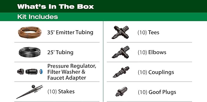- Convenient Drip irrigation kit has everything needed to water up to a 4’ x 8’ raised bed garden