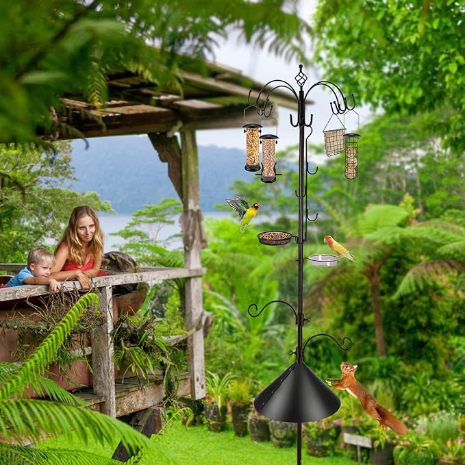 - MULTIPURPOSE BIRD FEEDER HOOKS: This bird feeder station for outside has multiple hooks. The bird feeder pole has four W-shaped hooks at the top for hanging larger bird feeders or nests; and two additional hooks where you can hang night lights, plant baskets or other items to add a different look at your garden or patio