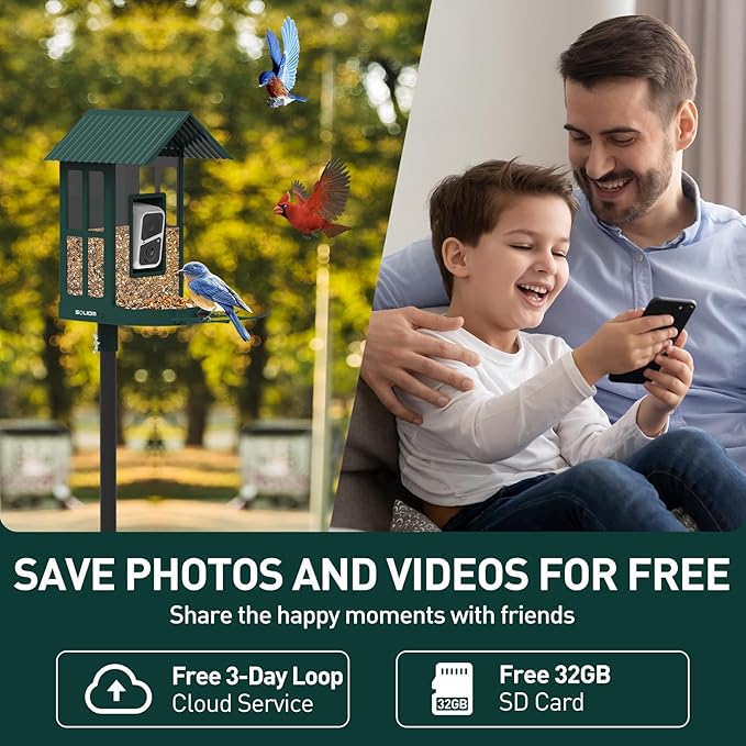 - Free Store & Perfect Gift for Bird Lovers with Lifetime Guarantee- Soliompro smart bird feeder with camera will record the birds videos and store in the Cloud for up to 3 days loop recording, and you can extend it by subscription or store them in the free 32G card. Share lovely moments with friends or family increasing communication and bond, it is a great outdoor present for kids and the elderly