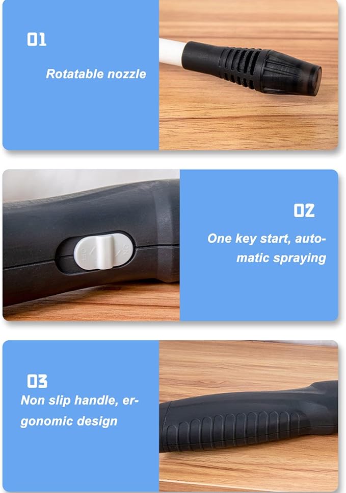- [ONE-BUTTON The electric mister is designed for fingers from continuous pressing and spraying, the garden sprayer will start watering with one quick press and stop with one press as well. You can easily finish your work with the help of this electric water sprayer and get rid of tiring your hands and wrist. The ergonomic On/Off button of this auto spray bottle design brings you tool comfort.