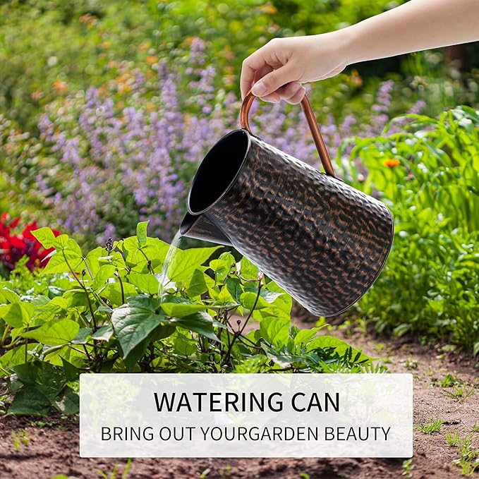 - The unique hammered pattern design on the surface adds a touch of personality and character to the watering can. It not only serves as a practical tool for watering plants, but also doubles as a decorative item for your garden or indoor plants.