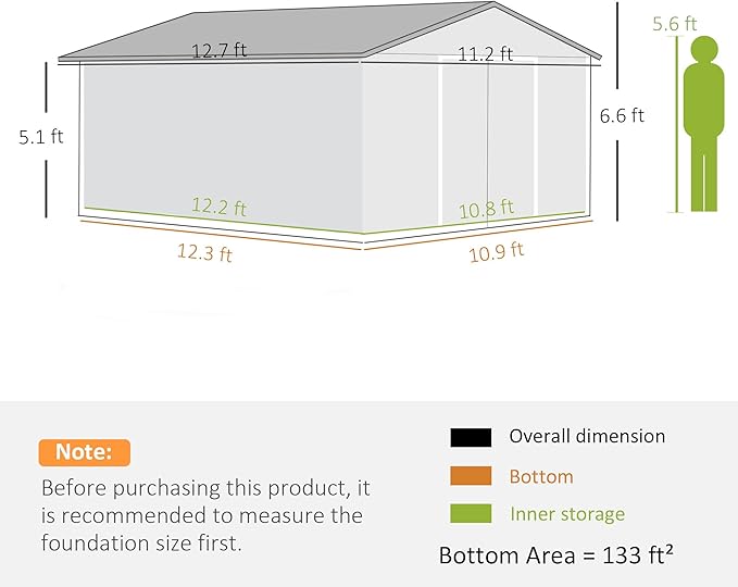 - Outdoor Storage Shed Info: Overall Dimensions: 133.75" W x 152" D x 78.75" H; Inside Dimensions: 130" W x 146.5" D. Assembly Required. Note: Requires at least three people to install it in five hours. Do not install in strong windy conditions.