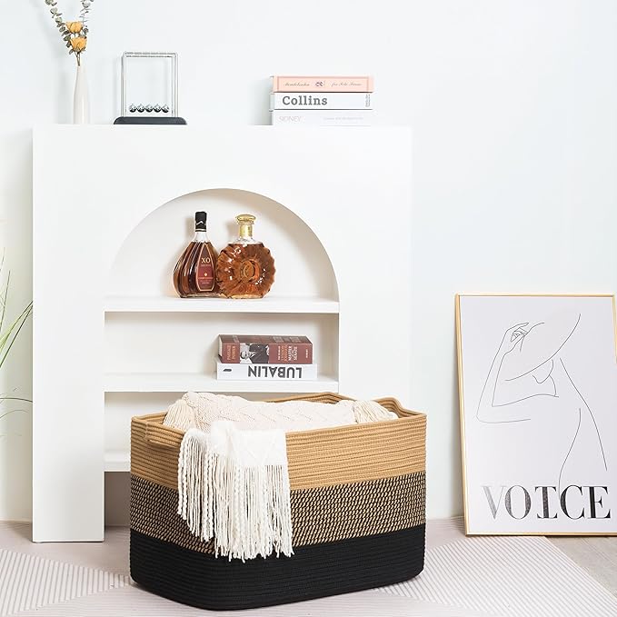 - Decorative Storage Baskets for Home Decor - A stylish, practical alternative to other boring storage solutions. Not only will our large storage baskets help you get organized, their sleek, sophisticated shape and neutral colors will complement any decor and any room: the bathroom, playroom, bedroom, living room, laundry room, mudroom, home office, entryway & more.