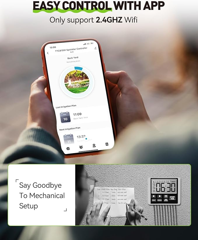 - Control From Anywhere - Free App: RAINPOINT WiFi sprinkler controller supports 2.4GHz WiFi so you can manage your watering schedule effortlessly using the RAINPOINT APP. (Only support 2.4GHZ Wifi) Stay connected and in control whether you're at work or on vacation. Share data with family or homeowners for collaborative landscape management. Monitor irrigation calendars and history to refine future schedules and maintain a healthy yard.