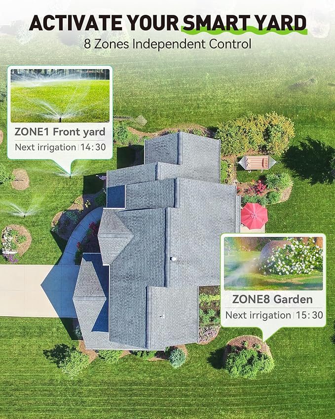 - Flexible Scheduling to Meet Your Needs: Create up to eight custom watering schedules for each zone, tailoring run times, start times, and cycle frequency as a sprinkler timer to suit your lawn's specific needs. Need more water? Need immediate watering? Just tap the Quick Run feature via the app without affecting existing plans. Customize each zone with a name and picture for easy identification and management - A smart automatic watering system is in your hands!