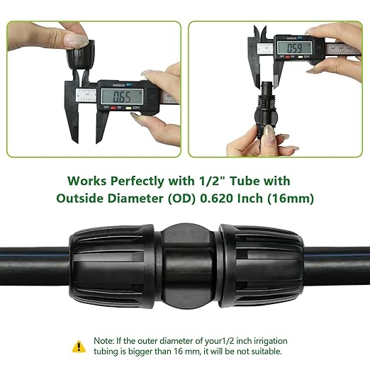 - 【Fits 1/2 Inch Drip Irrigation Tubing】These barbed locked drip line coupler connectors fit 1/2 drip irrigation hose with 0.600-0.650 inch outer diameter (OD) and 1/2 inch inner diameter (ID).