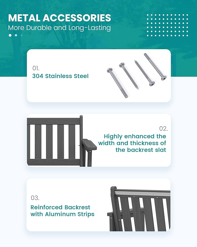 - High Weight Capacity: Tested to support up to 660 lbs, this outdoor bench is suitable for people of various body types and sizes. Its sturdy structure and premium materials ensure lasting performance.