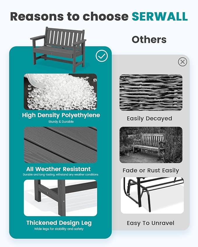 - All-Weather Resistant: The SERWALL garden bench is made of durable high-density polyethylene (HDPE), along with 304 stainless steel hardware, making it resistant to various weather conditions and ensuring long-lasting durability. It is an ideal choice for any outdoor environment.