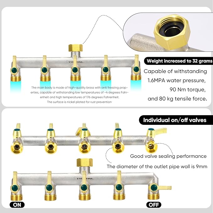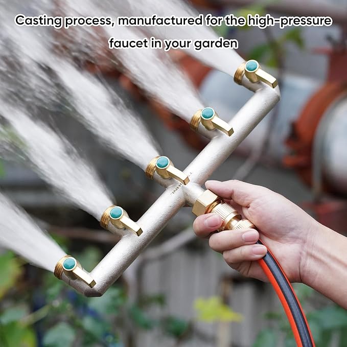 - 4: Add 10 grams of brass material to this hexagonal water inlet nut, after repeated large pressure and torque tests, it continues to maintain a solid link and sealing; the water inlet is GHT 3/4-inch female threads and the 5-way outlet is GHT 3/4-inch male threads, which is compatible with all North American standard 3/4-inch faucets, garden hose couplings, and watering fixtures, and maintains long term stable operation and water tightness.