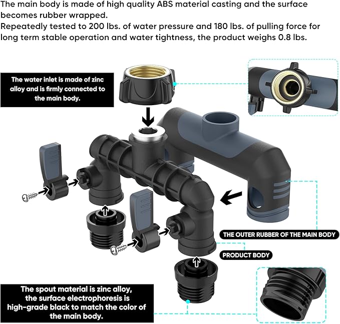 - 1: The main body is made of high quality ABS material, the female and male teeth are made of metal, after the repeated tests of pressure tester 200 lbs pressure test - tensile tester 120N tension, it can maintain long-term stable operation and water tightness, the weight of the product is 0.6 lbs.