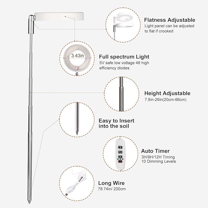 - 📏 Space-Saving Adjustable Height - Telescopic arm (8"-26") fits tabletop planters, shelf gardens, or hanging pots, positioning the grow light at ideal PAR distance for each plant type
