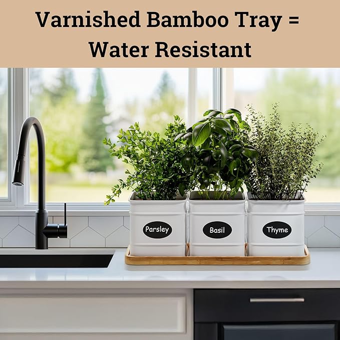 Herb Planter Indoor - 3 Iron Herb Pots with Drainage Holes, Varnished Bamboo Tray, Customizable Labels & Marker Pen - Indoor Herb Garden Planter - 3 Pots for Herbs - Inside Spice Garden - Basil Pot