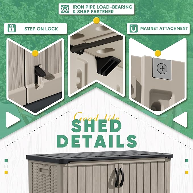 - Safe Storage: Our storage shed is double-protected by foot switch and top magnet, which can make the door close safely and firmly, and the foot switch with bottom pin can avoid squatting, which is convenient and labor-saving