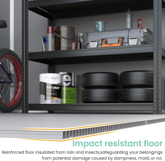 - RESIN MATERIAL: Our storage shed is crafted with 12MM premium polypropylene resin plastic, which is recyclable and eco-friendly. Resin shed is corrosion-resistant, waterproof, rustproof and with UV protection for more than 8000 hours, less bending and puncturing, worry-free for use in all weather conditions. It can be used daily for five years without fading