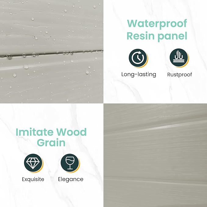 - RESIN MATERIAL:Our storage shed is crafted with 12 MM premium polypropylene resin plastic, which is recyclable. Resin shed is corrosion-resistant, waterproof, rustproof and with UV protection for more than 8000 hours, less bending and puncturing, worry-free for use in all weather conditions. It can be used daily for five years without fading