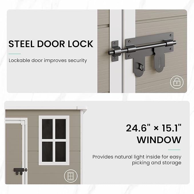 - STURDY FLOOR & WINDOW: Equipped with a sturdy floor, our outdoor storage cabinet effectively prevents moisture from seeping into the structure, safeguarding your belongings from potential damage caused by dampness, mold, or rot. The window design facilitates ventilation and natural light. It allows the visibility of tools from the outside and enhances the aesthetics of the shed