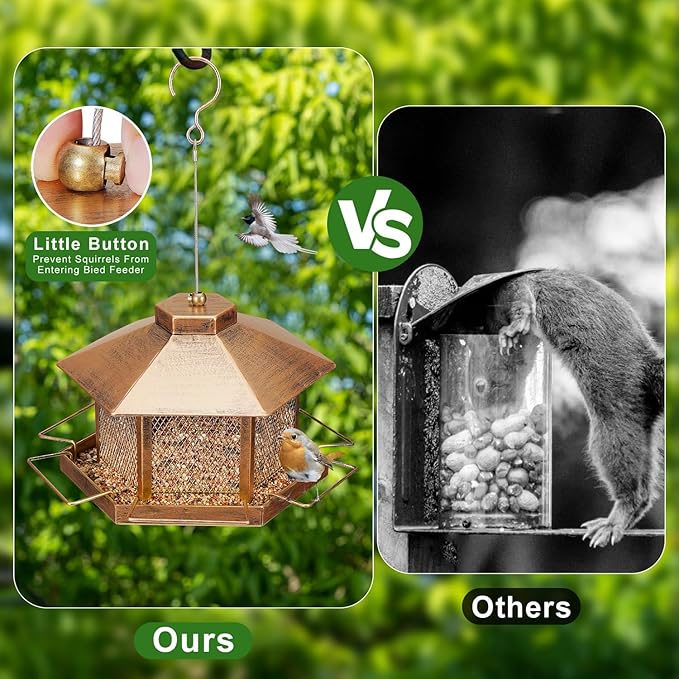 - SQUIRREL-PROOF & WEATHER-RESISTANT Unlike flimsy plastic feeders, the DTEPFUEN bird feeder is made of heavy-duty metal to withstand squirrel damage and harsh weather. The metal roof and perches prevent squirrels from chewing through, while the powder-coated finish resists rust, ensuring long-lasting use outdoors.