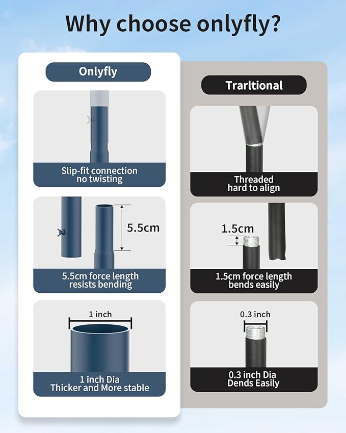 - 【Long-Lasting Stability】The 5-prong base features a reinforced weld design for solid ground support, preventing breakage and ensuring durability. The thicker pole, 1-inch diameter and 1mm thickness, connects via a slip-in method for a depth of up to 5.5 cm between poles. This design is much stronger than the 1cm threaded connections, offering improved resistance to bending and breakage. It provides ample weight capacity, perfect for enduring storms, winter snow, and multiple bird feeders.