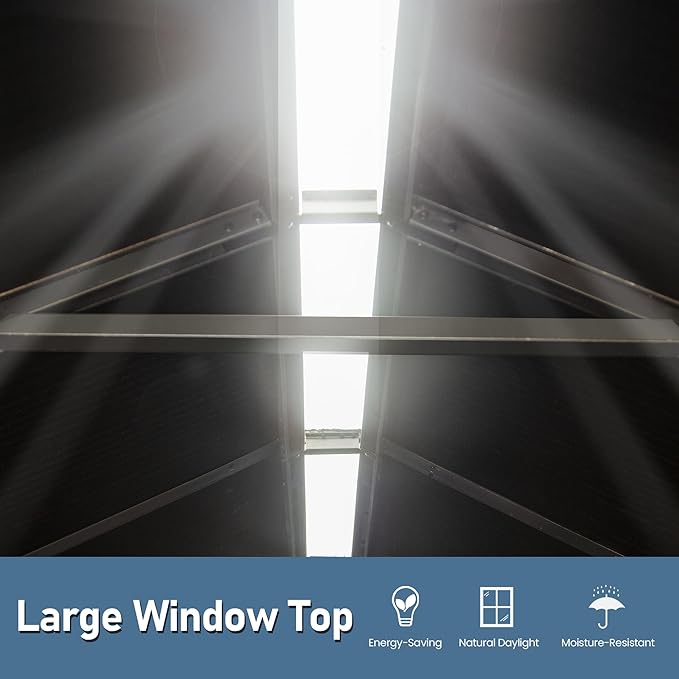 - Integrated Ventilation & Water Drainage: Features built-in air vents for improved airflow and an integrated rain gutter system that channels water away from the structure to help prevent leaks and interior moisture buildup.