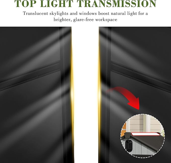 - Transparent Windows & Louvered Vents: Featuring transparent skylight and windows, the tools shed maximizes natural daylight for improved visibility and comfort. The louvered vents ensure optimal air circulation to effectively prevent odor buildup.